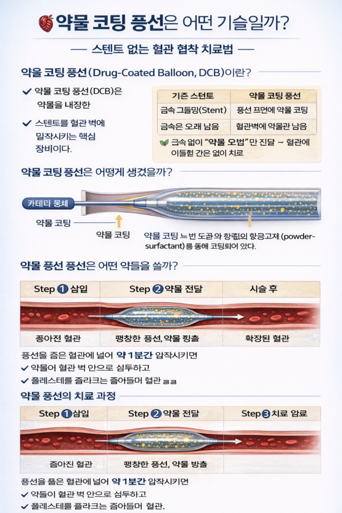 약물풍선(DCB, Drug-Coated Balloon)은 스텐트 없이도 혈관 재협착을 줄이는 최신 심장혈관 치료법이다. 어떤 약물과 코팅 기술이 사용될까?